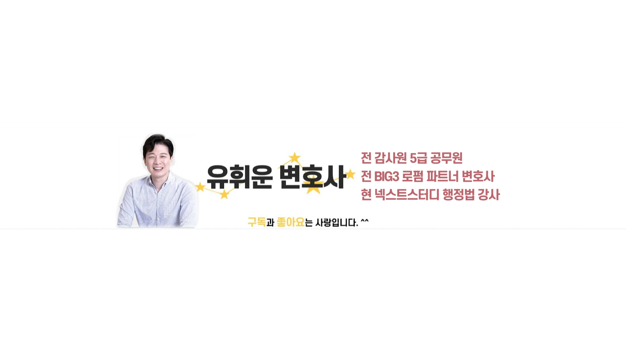 * 21. 3. 추가* - 강의보기 : (넥스트공무원) https://www.megagong.net/teacher/home.asp?bcode=allawyer - 질의응답 : (유휘운 행정법 카페) https://cafe.naver.com/exampasslaw - 영상보기 : (공무원변호사TV) https://www.youtube.com/allawyer -------------------------------------------------------------------------------------------------------------------------------------------------------------- * 19. 12. 개설* 안녕하세요, 아래와 같이 5급 공무원 + 대형로펌 변호사로 10년 경력을 쌓고 행정법 강의를 준비 중인 유휘운 변호사 입니다. - 감사원 5급 공무원 - BIG3로펌 행정소송팀 파트너 변호사 - 한국부패방지법학회 이사 -