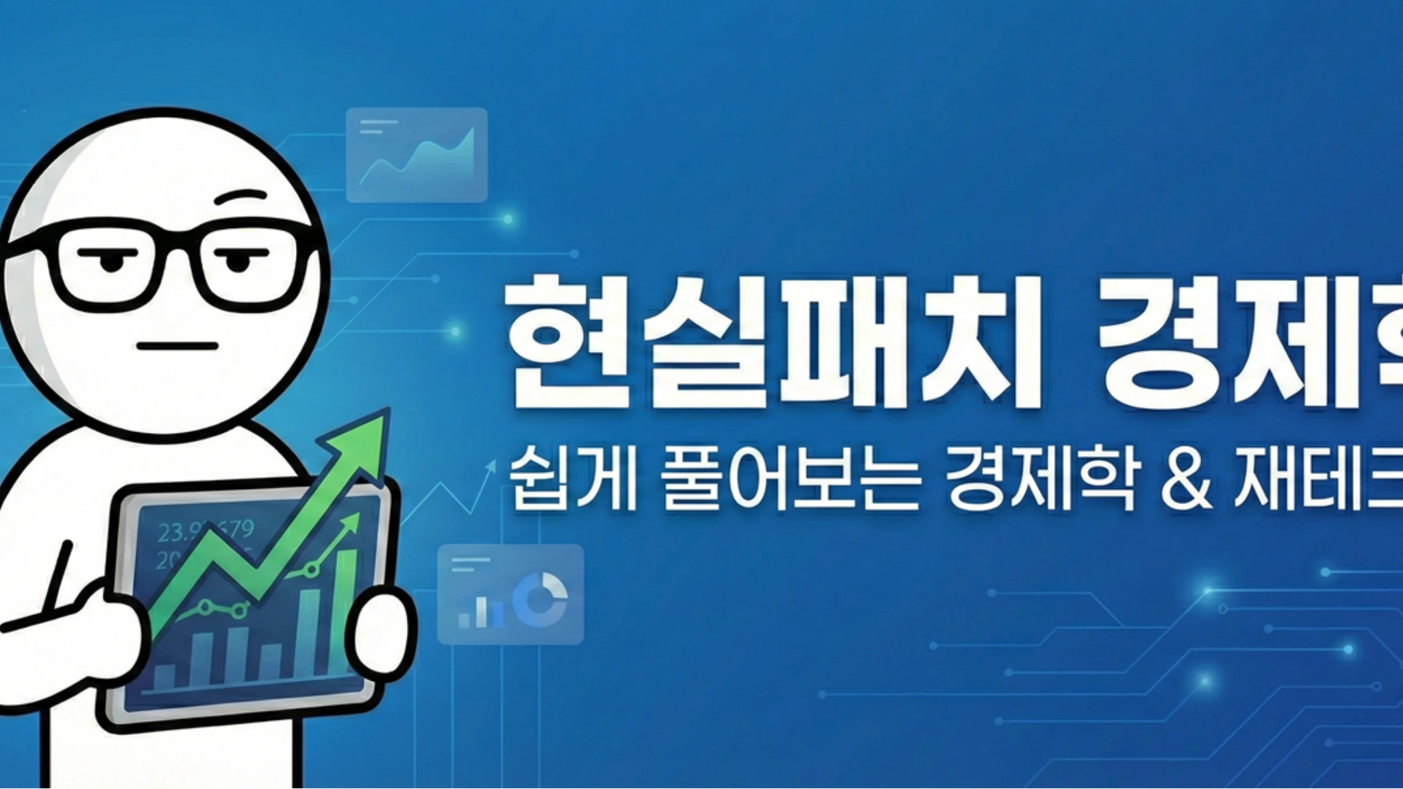 뜬구름 잡는 어려운 경제 이야기는 그만! 내 통장과 계좌에 당장 도움 되는 진짜 재테크, [현실패치 경제학]입니다. 뉴스에서 떠드는 거시경제 지표들, 알면 좋지만 당장 내 연금계좌와 주식 포트폴리오에 어떻게 적용해야 할지 막막하셨죠? 안경 쓴 스마트 졸라맨이 복잡한 경제 흐름과 차트를 누구나 이해하기 쉽게 쏙쏙 풀어드립니다. 감이나 소문이 아닌, 명확한 데이터에 기반하여 '잃지 않는 투자 시스템'을 구축하는 방법을 공유합니다. [현실패치 경제학]에서 다루는 핵심 주제 실전 파이어(FIRE) 프로젝트: 흔들리지 않는 3억 포트폴리오 구축과 조기 은퇴 플랜 파이프라인 세팅: 매월 200만 원의 든든한 현금 흐름을 만들어내는 배당 시스템 스마트 자산배분: ISA, 연금저축, 미국 주식 직투를 아우르는 계좌 활용법 및 세금 방어 전략 경제 읽어주는 졸라맨: 딱딱한 경제 지표를 내 지갑 사정에 맞춰 아주 쉽게 번역! 감정에 휘둘리지 않는 이성적인 투자, 이제 막막해하지 마세
